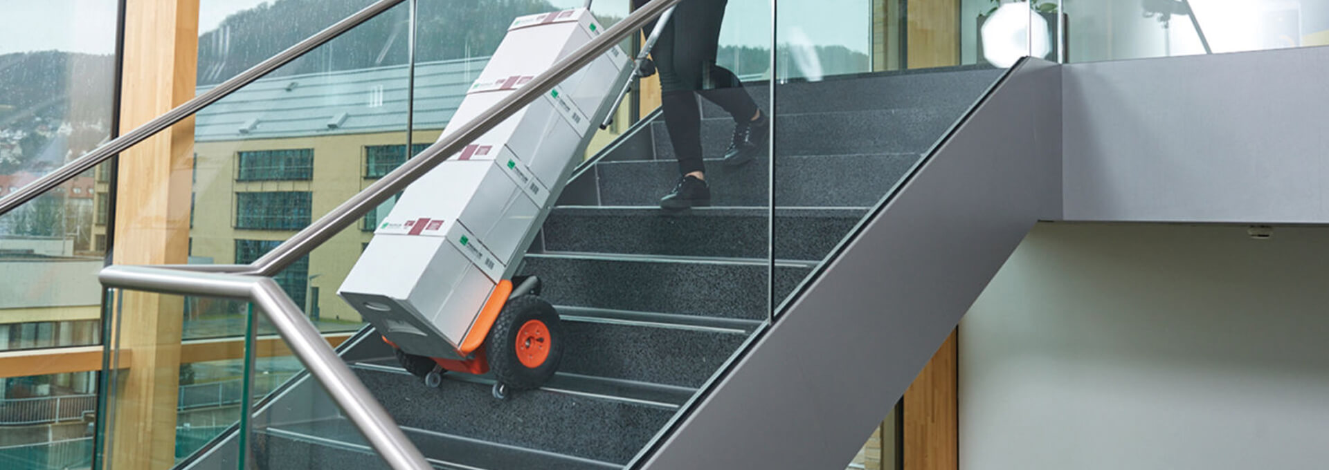 At EXPRESSO, you can choose from four different types of stair climbers. We distinguish between manual and electrically driven solutions, which take even more work off your hands with the help of a rechargeable battery. This makes it easy to maneuver stairs with loads of up to 200 kg.