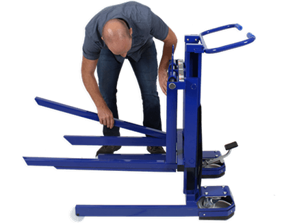Stufenlose Einstellung der Gabelzinken auf verschiedene Paletten-Formen möglich.